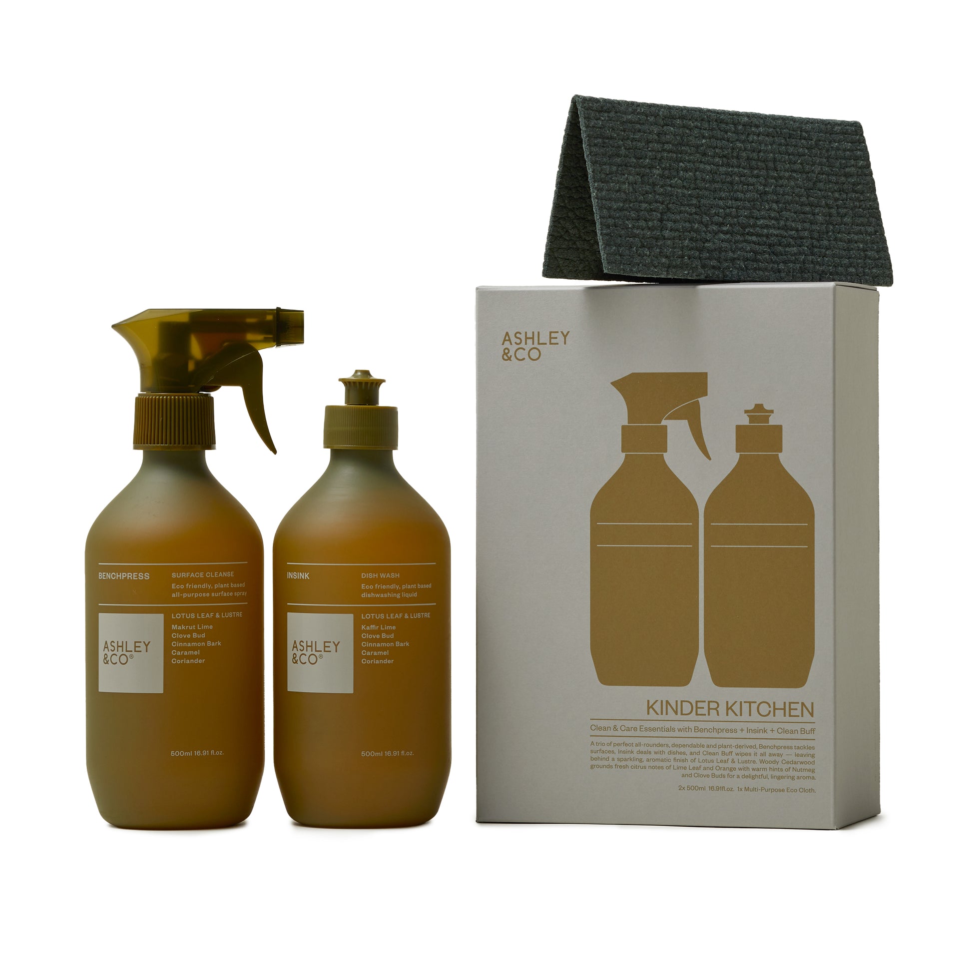 - A trio of perfect all-rounders - dependable and plant-derived, Benchpress tackles surfaces, Insink deals with dishes and Clean Buff wipes it all away, leaving behind a sparkling, aromatic finish of Lotus Leaf & Lustre.