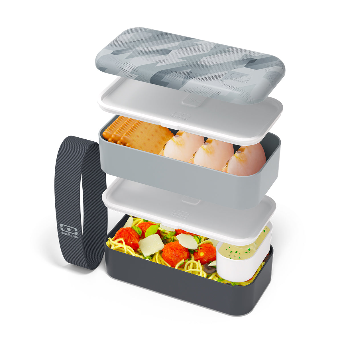 The MB Original is a two-tiered lunchbox with an extra food cup inside to separate food items. There are intermediate lids that separate the two boxes while keeping everything secure inside.
